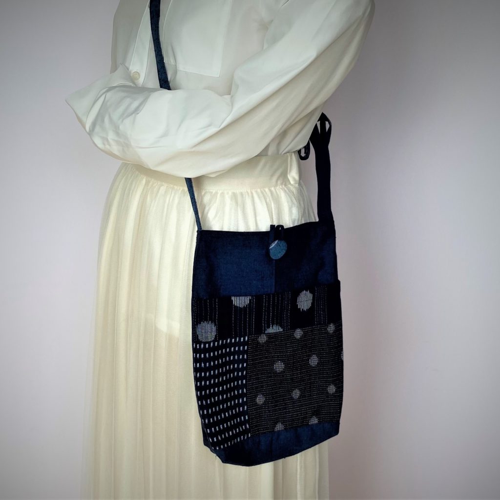 ☆ご覧頂きありがとうございます☆ ハンドメイド専門店 haru工房へようこそ ☆セールスポイント 絣(久留米織)を利用した小型サイズのバックです。 伝統的な手法で織られる絣ですが、伝統的な柄だけではなく現代的な柄も増えてきています。 伝統的な絣を各種組み合わせて、カジュアルな雰囲気にデザインしています。 開口部はボタンホックが付いています。 紐を縛ることで、長さを調節できます。 折りたたむことができますので、小さくして持ち歩き お出かけ時のサブバッグとしてもお使いいただけます。 ☆サイズ 外寸 ・縦 約25.5cm(持ち手含まず) ・横 約21cm ・マチ 約5cm ・持ち手長さ 約129cm最長 ・外ポケット有り 若干の誤差はご了承ください。 ☆素材 綿