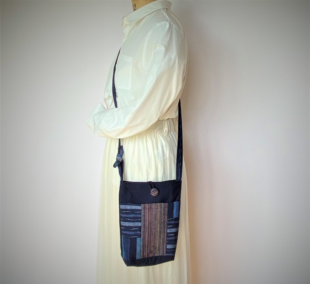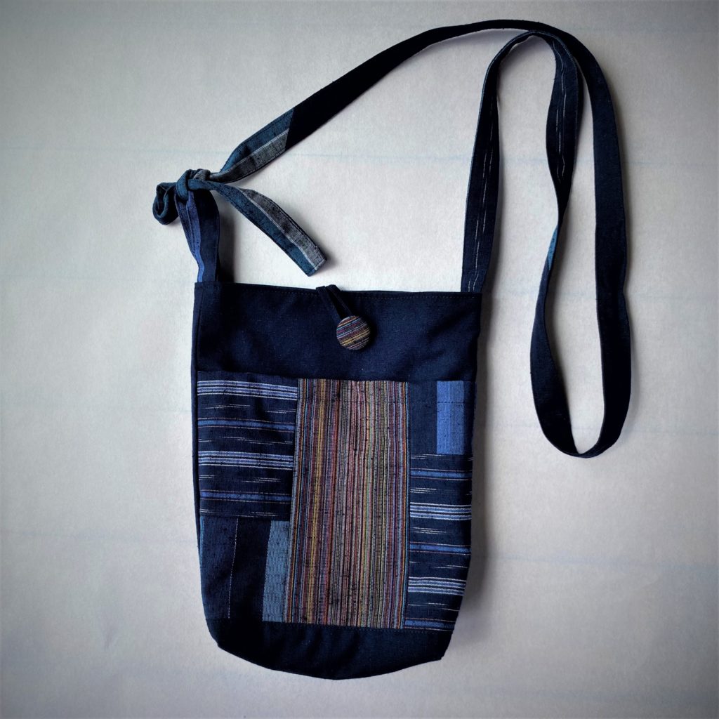 ハンドメイド専門店 haru工房へようこそ ☆セールスポイント 絣(久留米織)を利用した小型サイズのバックです。 伝統的な手法で織られる絣ですが、伝統的な柄だけではなく現代的な柄も増えてきています。 伝統的な絣を各種組み合わせて、カジュアルな雰囲気にデザインしています。 開口部はボタンホックが付いています。 紐を縛ることで、長さを調節できます。 折りたたむことができますので、小さくして持ち歩き お出かけ時のサブバッグとしてもお使いいただけます。 ☆サイズ 外寸 ・縦 約25.5cm(持ち手含まず) ・横 約21cm ・マチ 約5cm ・持ち手長さ 約129cm最長 ・外ポケット有り 若干の誤差はご了承ください。 ☆素材 綿