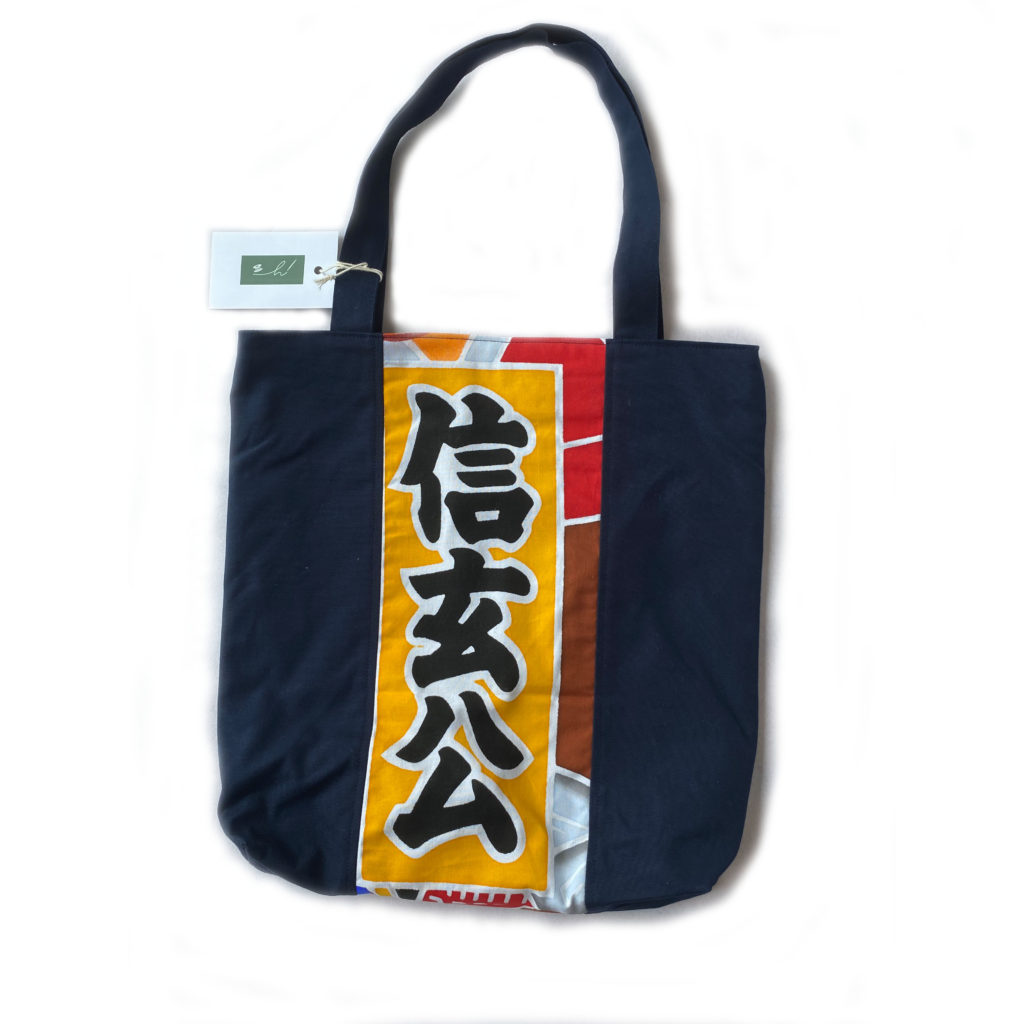 武者絵幟旗の布地を利用して手さげバックへリメイクしました。武者絵幟旗は未使用品です。